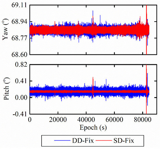 The dispersion of yaw angle for SD-Fix in Figure 6 seems the same as DD-Fix; this is consistent with most studies. However, due to the existence of multipath, the STDs of pitch angles in Table 3 are not two-fold less than that of DD-Fix. As shown in Figure 7, after extracting and eliminating the multipath in attitude solution by empirical mode decomposition (EMD) [28], the dispersion of SD-Fix is as expected smaller than that of DD-Fix. Combining with the STDs in Table 4, the STDs of pitch angles for SD-Fix can reach 0.2°, which is twice less than DD-Fix, and consistent with previous research [6].