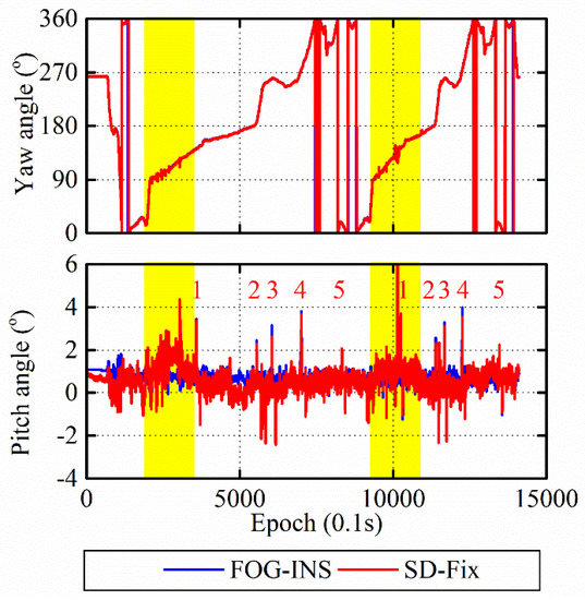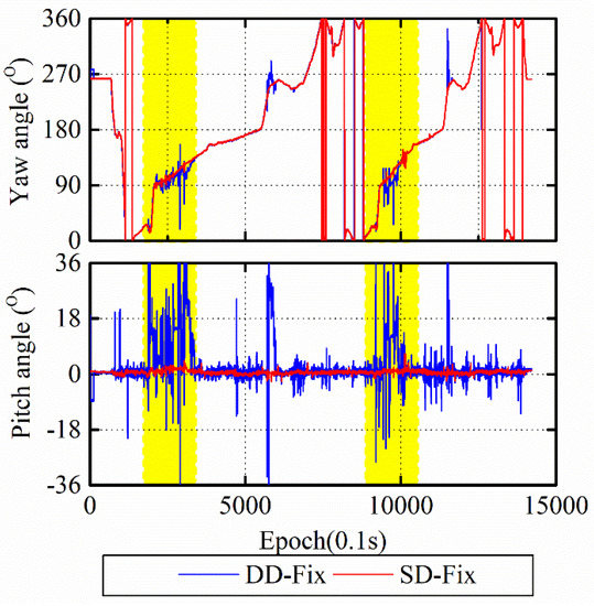 As seen from Figure 10 (top), when the number of satellites is sufficient, the performance of the yaw angle is identical between SD-Fix and DD-Fix. The number of satellites is only three, and the yaw angle diverges from the DD-Fix while the SD-Fix is still stable. This divergence is more evident in the pitch angle result in Figure 10 (bottom), and the DD-Fix cannot obtain reliable results for the pitch angle.