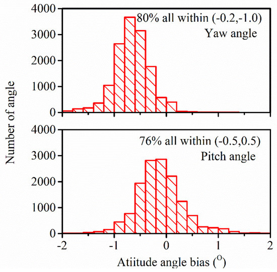 After the above estimation process of KF with the ambiguity substitution approach, the float baseline vector and SD ambiguities with integer characteristics can be exported. Then, LAMBDA or bootstrapping can be used to obtain the fixed ambiguities and baseline vector. Finally, converting the baseline vector to the local East–North-Up frame, we compute the yaw angle and pitch angle from the baseline coordinates , , as [26]: