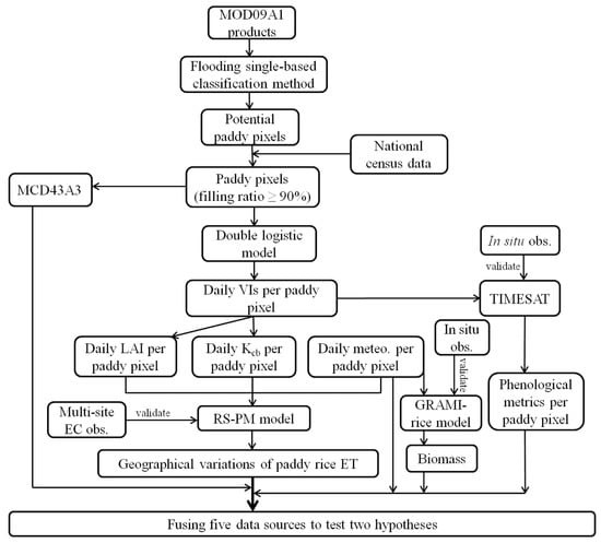 The pathway diagram of earth observations and numerical simulations to test the two hypotheses through analyzing the correlations among geographical variations of the ET, Ts, and biophysical factors of paddy field is illustrated in Figure 1. The flooding single classification method using the Moderate Resolution Imaging Spectroradiometer 8-day surface reflectance products (MOD09A1) was adopted to detect the extent of paddy rice fields and quantify the FFTD of paddy field in South Korea from 2011 to 2014. Potential paddy rice pixels, detected by the flooding single classification approach [], were geographically overlapped by a 5m resolution land use and land cover map (Supplementary Materials SP1 and Figure S1); such pixels with homogeneity percentage ≥90% (i.e., rice area of an individual grid cell was ≥90%) were filtered. Daily vegetation indices (VIs) per paddy pixel were produced using the double logistic model, which help develop daily LAI and Kcb per paddy pixel according to field relationships among the VI of interest, LAI, and Kcb. Geographical variations of the ET of paddy fields were obtained via fusing daily LAI, Kcb, and meteorological variables to drive the RS-PM model that was comprehensively calibrated and validated using eddy covariance observations. Phenological metrics of paddy rice were extracted from the MODIS VIs data using the TIMESAT (i.e., a software package for analysing time-series of satellite sensor data) that was validated by field observations. The detailed processes involved by earth observations and numerical simulations are stated in the following sections.