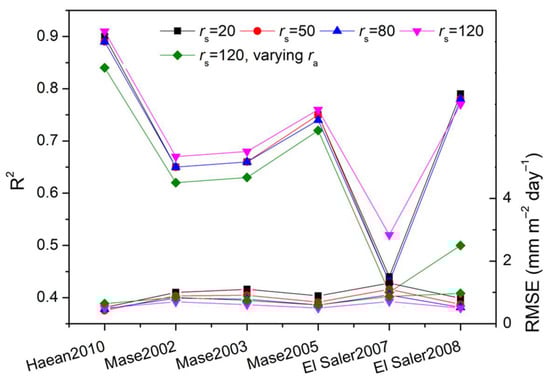 Multi-site evaluations of the FAO-56PM model of the pixel-based RS-PM model with the constant aerodynamic resistance (ra) of 208.0/WS for varying bulk surface resistances values (rs), ranging from 20, 50, and 80 to 120 s m−1 and varying ra values with a constant rs value of 120 s m−1 in the Haean in South Korea in 2010, Mase in Japan from 2002 to 2005, and El Saler-Sueca in Spain from 2007 to 2008. R2: the determination coefficient; RMSE: the root mean square error (mm m−2 day−1); WS: wind speed (m s−1).