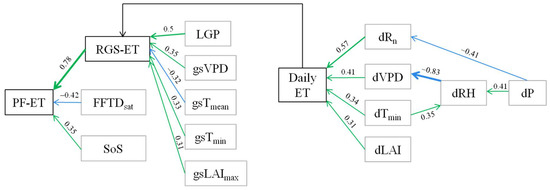 Apath diagram presenting significant relationships and the causal direction for the paddy field total ET (PF-ET, the sum of daily ET from the FFTDsat to the EGS, mm m−2), and the rice-growing season total ET (RGS-ET, the sum of daily ET from the SoS to the EGS, mm m−2), with various biophysical factors, including the growing season onset of rapid canopy expansion (SoS, DOY), the first date of field flooding and transplanting identified by satellite observations (FFTDsat, DOY), the length of the growing period (LGP, days), the mean vapor pressure deficit (gsVPD, kPa) during the growing season, the daily mean air temperature (gsTmean, °C) during the growing season, the mean minimum air temperature (gsTmin, °C) during the growing season, the maximum leaf area index (gsLAImax, m2 m−2) during the growing season, the daily net radiation over the rice-growing season (dRn, MJ m−2 day−1), the daily VPD(dVPD, kPa), the daily Tmin (dTmin, °C), the daily LAI (dLAI, m2 m−2), the daily relative humidity (dRH, %) and the daily precipitation (dP, mm). Numerical value attached to the arrow symbol was path coefficient. Green (blue) sign indicated a positive (negative) correlation. DOY: the day of year.