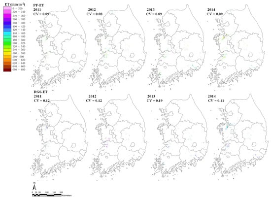 Spatial variations of paddy field total ET (PF-ET) and the rice-growing season total ET (RGS-ET) from 2011 to 2014 in South Korea. PF-ET: the sum of daily ET from the FFTDsat to the EGS (mm m−2); RGS-ET: the sum of daily ET from the SoS to the EGS (mm m−2); CV: the coefficient of variation. EGS: the seasonal onset of the rapid canopy expansion (DOY); FFTDsat: the first flooding and transplanting date detected by satellite remote sensing (DOY); DOY: the day of year.