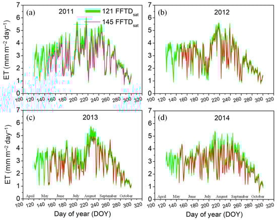 Seasonal courses of daily ET (mm m−2 day−1) in paddy fields in which the first dates of field flooding and transplanting (FFTDsat) were 121 DOY and 145 DOY in 2011 (a), 2012 (b), 2013 (c), and 2014 (d). DOY: the day of year.