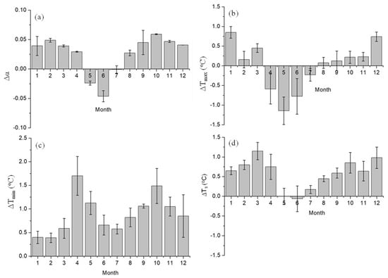 Intra-annual changes in the maximum/minimum air temperature difference (ΔTmax, ΔTmin, respectively) between paddy rice and the temperate forest are presented in Figure 7b,c. The monthly ΔTmax had a bottom-down bowl curve or V-shaped pattern with positive values at the start and end of the year and negative values from April to July. The lowest negative value (−1.25 °C) was recorded in May when flooding had started or finished in most paddy rice fields. The time node when the negative sign of ΔTmax shifted to positive was August. Although positive signs were found in August and September, the ΔTmax values in the two months were relatively lower than 0.25 °C. The ΔTmin value remained positive from January to the end of the year, with the highest values recorded in April and October (Figure 7c). Except for the winter, ΔTmin values were greater than 0.5 °C in the other three seasons. Taking the mean of ΔTmax and ΔTmin into consideration, seasonal changes in profiles of ΔTs were observed (Figure 7d), showing a shallow bottom-down bowl shape similar to that for the ΔTmax. However, negative ΔTs values were found in May and June, and a positive value slightly lower than 0.25 °C was observed in July, wherein ΔTmax was negative. It was obvious that the nighttime warming amplitudes in April and July outpaced the daytime cooling, resulting in the positive ΔTs values in two months.