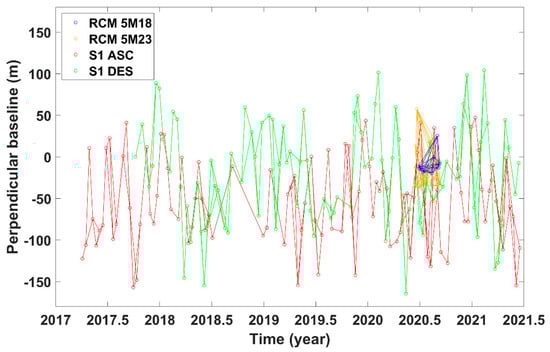 Perpendicular baselines of Sentinel-1 (S1 ASC: ascending, S1 DES: descending) and RCM (RCM 5M18: descending 5M18 mode, RCM 5M23: descending 5M23 mode) InSAR pairs (red: Sentinel-1 ascending, green: Sentinel-1 descending, blue: RCM descending 5M18 mode, yellow: RCM descending 5M23 mode).