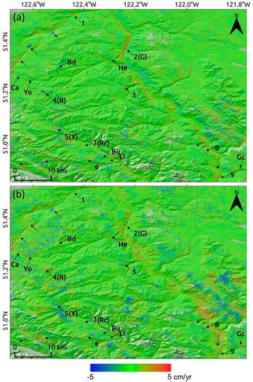Linear deformation rate maps of east–west (a) and vertical (b) movements from October 2017 to June 2021. The black arrows point to potential slope movements. The numbers are the sites discussed in Figure 4, Figure 5 and Figure 6. The abbreviations are the earthflows reported from [,]: G = Grinder Creek; He = Heginbottom Creek; Bd = Black Dome; Ca = Canyon; Yo = Yodel; R = Red Mountain; Y = Yalakom River; Rc = Retaskit Creek; Bu = Burkholder Creek; Ll = Lac La Mer; Gc = Gillon Creek. The 2D linear deformation rate map files are provided in the Supplementary Materials.
