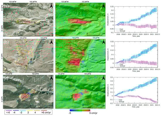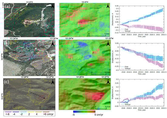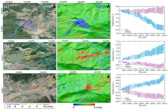 Close-ups of Sites 4–6 (a–c, respectively) of Google Earth imagery (left) and the Sentinel-1 east–west movement map overlaid on the hillshade DEM (middle) with Sentinel-1 2D time-series plots (right; cumulative east–west (blue) and vertical (purple) movements extracted from 5-by-5 pixels marked in black squares in the middle panels). The color-coded contours and dashed black arrows in the left panels represent the east–west movement rates estimated by Sentinel-1 and the direction of earth flows, respectively. The error bars in the time-series plots represent the standard deviations of the 5-by-5 pixel measurements. Figure 5a represents the documented earthflow at Red Mountain and Figure 5b represents the largest documented earthflow at Yalakom River [].