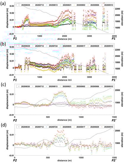 LOS time-series analysis of Site 5 displacement profiles. (a) RCM P1-P1′ profile, (b) Sentinel-1 P1-P1′ profile, (c) RCM P2-P2′ profile, (d) Sentinel-1 P2-P2′ profile. The black dashed lines represent elevations along the profiles.