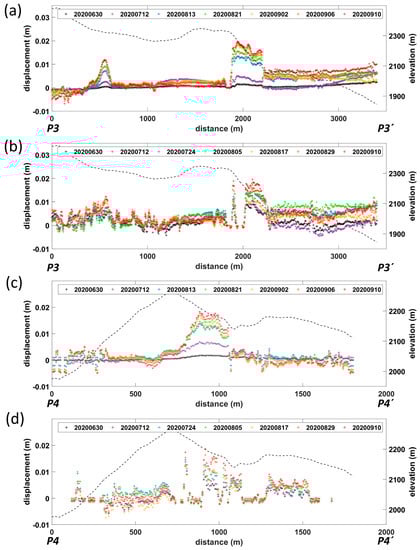 LOS time-series analysis of Site 6 displacement profiles. (a) RCM P3-P3′ profile, (b) Sentinel-1 P3-P3′ profile, (c) RCM P4-P4′ profile, (d) Sentinel-1 P4-P4′ profile. The black dashed lines represent elevations along the profiles.