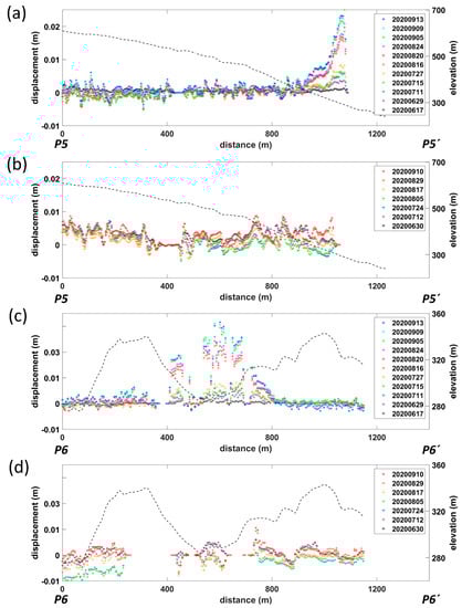 LOS time-series analysis of Site 9 displacement profiles. (a) RCM P5-P5′ profile, (b) Sentinel-1 P5-P5′ profile, (c) RCM P6-P6′ profile, (d) Sentinel-1 P6-P6′ profile. The black dashed lines represent elevations along the profiles.