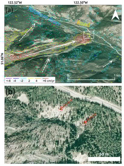 Earthflows at Yalakom River on Google Earth imagery (a) and its close-up view of the toe of the largest earthflow (b). The color-coded contours are the east–west movement rates estimated by Sentinel-1. The white rectangle represents the extent of Figure 11b. The largest earthflow (solid white arrow) and surrounding smaller earthflows (dashed white arrows) are also represented in Figure 3, Figure 5b, Figure 7a, and Figure 8. Sediments at the toe of the largest earthflow have diverted the river channel, which is causing riverbank erosion on the east side of the river channel (solid red arrows), next to the road.