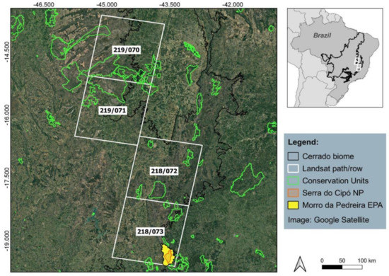 Spatial distribution of the Brazilian Cerrado (black outline in the small image) showing the four Landsat paths/rows (white squares) used in this study, highlighting the two conservation units (Serra do Cipó NP in orange and Morro da Pedreira EPA in yellow) selected as study areas for local evaluation of the algorithm performance. Green polygons indicate the location of the remaining conservation areas.
