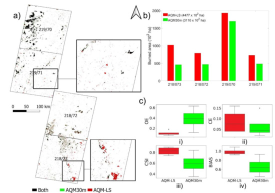 We first evaluated the total extent of BA retrieved by the AQM-LS and compared the results with those from the AQM30m product for the same period (Table 1). Figure 2 shows the comparison of both products for the four Landsat scenes. The BA retrieved by AQM-LS and AQM30m was in general similar in location (Figure 2a), albeit very divergent in magnitude. The AQM-LS algorithm identified a total of 447,700 ha of burned area, corresponding, to 7.5%, 3.9%, 3.1%, and 2.8% of Landsat scene 219/070, 218/073, 218/072, and 219/071, respectively (Figure 2b). By contrast, the AQM30m detected 30% less BA, representing 311,000 ha for the same period. The greatest difference between the AQM-LS and the AQM30m was found in scene 218/073, where the latter product estimated only half as much burned area. In scenes 218/072, 219/071, and 219/070, these differences are 41%, 34%, and 12%, respectively.