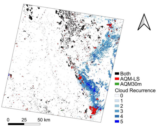 The statistical analysis of the accuracy assessment for both AQM-LS and AQM30m products on a pixel basis, derived from the contingency table and considering each of the four Landsat scenes is presented in Figure 2c. Overall, the AQM-LS product displays higher CSI values for all the Landsat scenes, in comparison with the AQM30m product. The AQM-LS product has much lower OE than AQM30m, while both products show very low CE. The underestimation by AQM30m is reflected in values of BIAS much lower than one. An example of the contrast between OE of the two BA algorithms is provided in Figure 3, which shows a fire scar with more than 8000 ha in Serra do Cipó NP. This fire event occurred between 16 and 20 October 2015 (Landsat scene 218/073) and was mapped by the AQM-LS product (in red) and confirmed by the presence of VIIRS active fires but omitted by the AQM30m product (in green). Indeed, the larger discrepancies between the two products occurred also in the scene 218/073, which is frequently cloudy (Figure 3); thus, the change detection based on temporal multitemporal composite approach adopted by AQM-LS performs much better than change detection approaches based on pairs of images used in the AQM30m product. In this region, cloud recurrence, defined as the number of times that a pixel is covered by clouds over the study area from 30 July to 3 November, reached the same pixels in every 5 dates. We observed high omission cases from AQM30m in cloudy areas, but by contrast, AQM-LS omitted few fire scars (Figure 3), highlighting the effectiveness of the compositing technique to minimize omission errors in cloudy areas.