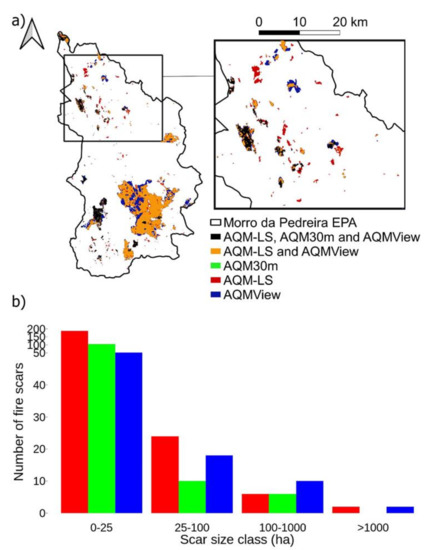 (a) Spatial distribution of burned area detected by AQM-LS (red), AQM30m (green), AQMView (blue), two products (namely AQM-LS and AQMView, orange), and the three products (black) in the Morro da Pedreira EPA (black outline) encompassing the Serra do Cipó NP from 15 August to 3 November 2015. (b) The corresponding total number of scars detected by BA products per scar size classes.