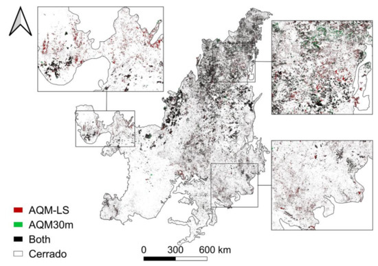 Spatial distribution of burned area detected by AQM-LS (red), AQM30m (green), and by both products (namely, AQM-LS and AQM30m, black) over Cerrado for 2015; insets show spatial detail of BA classification for areas in Northern, Southwestern, and Southeastern Cerrado.
