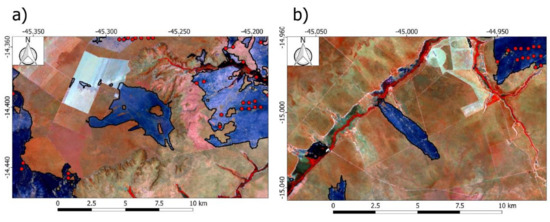 The need for active fires information as seed points for burned pixel classification on region growing techniques was circumvented by using the active fire-trained, one-class classification approach, which uses active fires not as spatial seeds but as spectral samplers for burned areas. Our results highlight active fires omission, due to short duration of the fire, or cloudiness at the time of overpass, which has impact on the final burned area classification [5,6,27,45,78]. In this sense, the use of AF as a training sample for a classifier would fill this gap, making it possible to map burned areas even with the absence of AF, as shown in Figure 6. For instance, in veredas areas (Figure 6), the vegetation is characterized by the predominance of the palm tree Mauritia flexuosa species and peat soils, which leads to the occurrence of underground fires not detected by satellites [79]. It is also possible to observe omissions from active fires in areas where burning occurred at a low intensity [49] and in areas with dense layers of smoke, which reduces the radiometric signal [26].