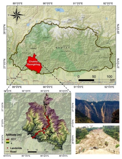 The case study of this research is Chukha Dzongkhag area (longitudes 89°15′–89°49′ and latitudes 26°44′–27°18′) located in the southwest of Bhutan (Figure 1). The area approximately covers 1879.5 km2. The area contains steep slope terrain, which makes it highly at risk of slope failures brought by rainfall and associated disasters due to several road cuttings [39].