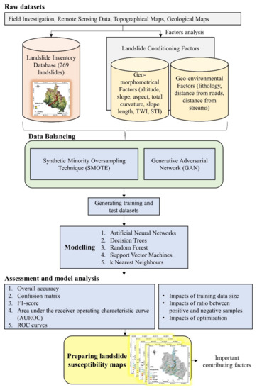 This study aims to develop and test a new method to correct the class imbalance in landslide datasets using generative adversarial networks (GAN) [29]. The method is based on oversampling landslide presence class with data generation. The method was then compared to other standard methods such as synthetic minority oversampling technique (SMOTE) [30] and tested with several machine learning models, including neural networks (ANN), random forest (RF), decision trees (DT), k-nearest neighbour (kNN), and support vector machine (SVM).