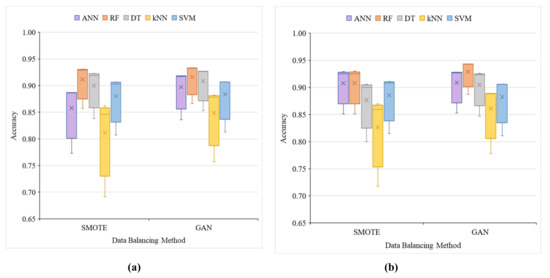Assessment of SMOTE and GAN data balancing methods using different machine learning models. The accuracy refers to the total combination of four multi-metrics including OA, Kappa Index, F1-score, and AUROC. (a) Default parameters, and (b) optimal models.
