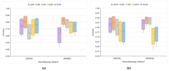 Assessment of DENSE and SPARSE data balancing methods using different machine learning models. The accuracy refers to the total combination of four multi-metrics including OA, Kappa Index, F1-score, and AUROC. (a) Default parameters, and (b) optimal parameters.