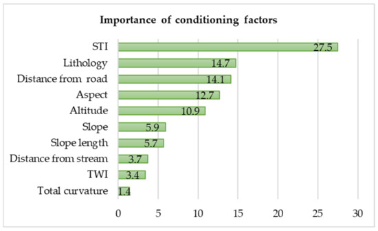 In this work, ten landslide conditioning factors were used based on previous works suggestions [8,9,10] (Figure 2). These include seven geo-morphological factors, such as altitude, slope, aspect, total curvature, slope length, topographic wetness index (TWI), and sediment transport index (STI). It also included three geo-environmental factors such as lithology, distance from the road, and distance from the stream. The details of these factors, including the calculation method, rationale, and the data range within the study area, are provided in Table 1.