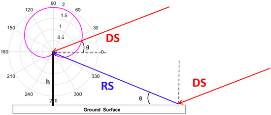 Figure 1. Scenario of Interference Generating of GNSS-IR, where θ is the elevation angle of the considered GNSS satellite, blue line represents the antenna gain pattern, and h is the antenna effective height. DS is the direct signal and RS the reflected one.