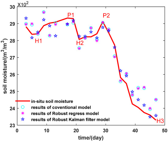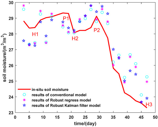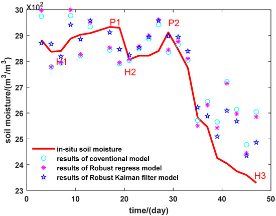 We compared the results of the three models by using multivariate variable dual-band with in situ soil moisture as our reference dataset. In the first 5 days, the Robust Kalman Filter model shows minimal differences with in situ data, and it is better than scenario one and two. The other two models have much more differences with in situ data. During days 5 until 20 one can see a gradual increase of the soil moisture for in situ data (from ~28*10−2 m3/m3 to ~29*10−2 m3/m3). For the Robust Kalman Filter model in general this growth is much faster and reaches a maximum intensity after 10 days. The second increase (days 20 to 30) of the in situ soil moisture is clearly identified by all the three models, and after day 35 models of conventional method and robust regression method differ from real measurements, but they are better than the other two scenarios. However, we can see clearly that the Robust Kalman Filter model improved the estimation results better than the robust/classical regressions, and it is also better than the previous scenarios.