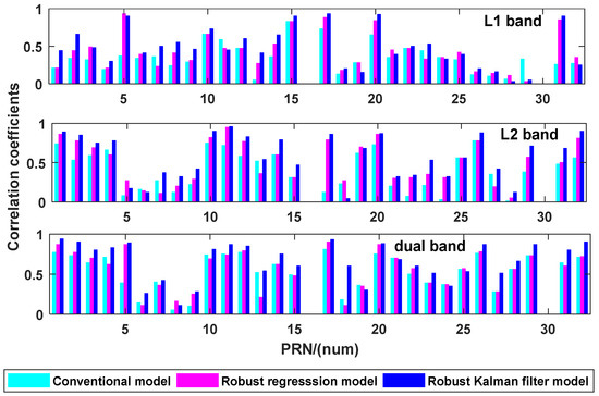 Compared with the conventional model, the robust regression model increases on average 28.77% for L1, 18.33% for L2 and 5% for dual-band. The correlation coefficient of the Robust Kalman Filter model increases on average 32.33% for L1, 28.14% for L2 and 19.10% for dual-band. As the statistical data shows, the Robust Kalman Filter model achieves the highest precision.