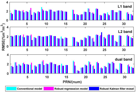 First, we discuss the results with amplitude. Compared to the conventional method, the RMSE of the robust regression model decreases by an average of 2.54% on L1 and 2.81% on L2, meanwhile the RMSE of the Robust Kalman Filter model decreases by an average of 10.19% on L1 and 12.39% on L2. Over half of the satellites’ RMSE are between 1% m3/m3 and 2% m3/m3 for the Robust Kalman Filter model.