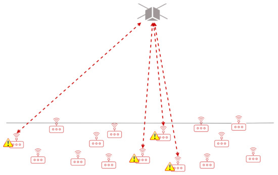 The architecture proposed in this article for the on-demand satellite payload execution strategy has to offer global coverage and be modular. However, additionally, the costs for deploying the constellation and network of sensors have to be kept low. A visual representation of the scenario is shown in Figure 1. In the scenario, there are the Earth-based sensors located on the Earth surface and also there are the satellite or satellites. It can be seen that when one or multiple Earth-based sensors detect a warning, this is forwarded to the satellite, and the satellite can then execute an EO payload if necessary.