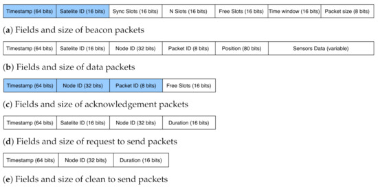 Control packets are used in some particular protocols, that require an orchestration from the satellite to transmit. These packets are the request to send (RTS), and the clear to send (CTS), whose format can be seen in Figure 2d,e.