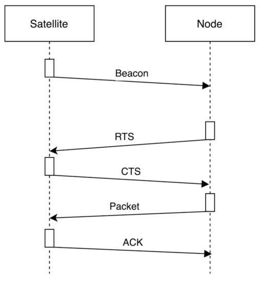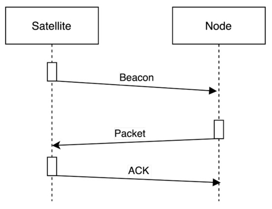 Random access asynchronised protocols allow contention-based access to the medium to all devices willing to transmit. The sequence diagram is shown in Figure 3. The packets exchanged are the beacon, which is first sent by the satellite to let the nodes know that they can transmit data, if necessary. After the beacon, the nodes send their data packets. In case of a collision free data packet transmission, the satellite responds with the ACK.