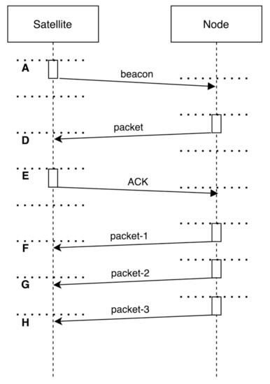 Random access synchronised protocols divide the channel into slots, so the nodes in the network can access the medium, starting their transmission at the begging of one of these time slots. These slots have the duration of the transmission time of the packets and have to be synchronised amongst all nodes in the network, so a precise time synchronisation is crucial. The sequence diagram for these types of protocols is shown in Figure 4. As with the asynchronised protocols presented in the previous section, the satellite first sends the beacon (A), so that nodes are aware that they can send their data packets to it. Then, in most cases, a given node transmits the data packet (D), and the satellite responds with an ACK (E) if it has been received correctly. However, some slotted protocols instead of using ACKs, send the same packet multiple times (F,G,H).