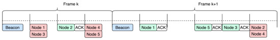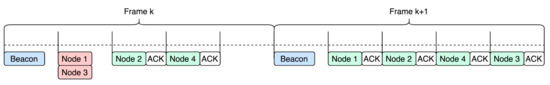 The E-Aloha [61] protocol proposes a solution to packets that are transmitted always with the same periodicity, to avoid permanent collisions. The access to the medium is also random, as with traditional Aloha, however, it proposes to fix a time window larger than the transmission time of the packets, so the nodes can select randomly the time at which they transmit within that time window, after receiving the beacon. By having this time window, nodes that have the same periodicity to send packets, vary the instant at which they transmit.