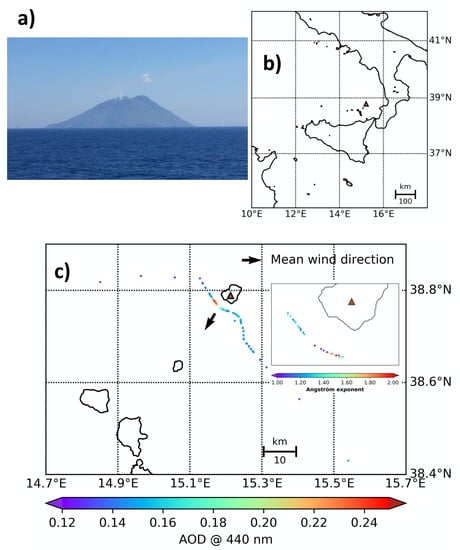 We wish to thank, Thierry Alix, the captain of the R/V “Pourquoi Pas?” as well as the whole crew for its indefatigable involvement in our scientific activities. This study is a contribution to the PEACETIME project (http://peacetime-project.org; last access 4 May 2021), a joint initiative of the MERMEX and ChArMEx components supported by CNRS-INSU, IFREMER, CEA and Météo-France as part of the decadal programme MISTRALS coordinated by CNRS-INSU. The PHOTONS service (http://www-loa.univ-lille1.fr/photons) and in particular Thierry Podvin, Luc Blarel and Gaël Dubois are gratefully acknowledged for the maintenance and pre- and post-campaign calibrations of the MII sun-photometer used in this study. On board data that were used in this paper to verify that the Stromboli plume was confined above the boundary layer were obtained using the French PEGASUS mobile platform, a shared facility of the LISA/EFLUVE institutes (www.pegasus.cnrs.fr (accessed on 6 October 2021). The seismological data used in this work to verify possible mild volcanic explosions during the measurement session are courtesy of Ornella Cocina of INGV.