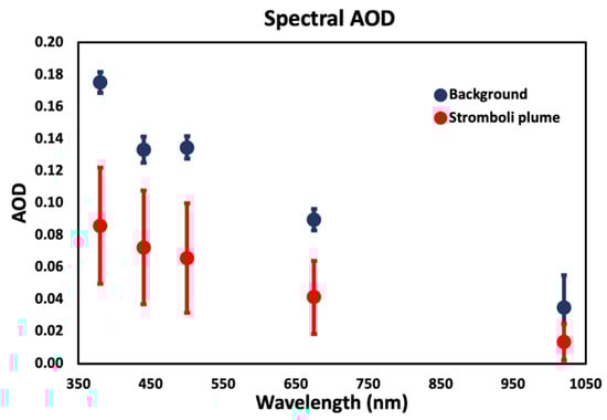 Average spectral AOD observations of the atmospheric background (in blue, AODB(λ)) and of the isolated Stromboli plume (in red, AODP(λ)), after the atmospheric background correction of Equation (1). The error bars of the spectral AODs represents the standard deviation of their means, linked to the AODs variability.