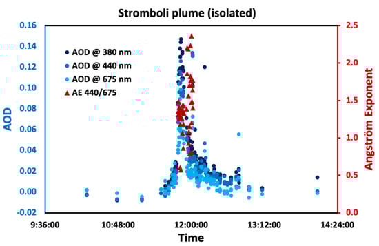 Atmospheric background corrected plume-isolated AODP for Stromboli plume at 380 (dark blue dots), 440 (blue dots) and 675 nm (sky blue dots), and plume’s AE (red triangles). Time is UTC.