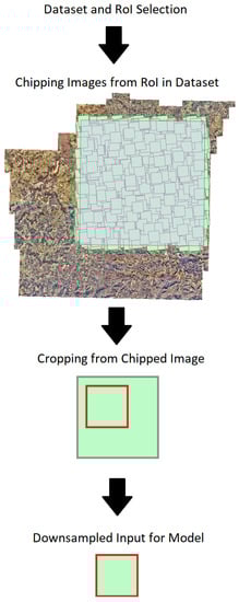 From each data set, 2000 3 × 3 km random crops and their locations were taken from the ROI and downsampled to 1000 × 1000 pixels for speed of image loading and manipulation. During training of the neural network, each one of these crops is randomly cropped again to 1.5 × 1.5 km and downsampled to 224 × 224 pixels. Thus, a full epoch of training exposes the network to 2000 images from each data set, each of which is at least slightly novel due to random cropping. The labels for the network are the latitude and longitude of the image centers (in implementation the upper left-hand corner location was used as the label, as this is the native format of world files. Because all images are North–South aligned, the image center is always 750 m down and to the right of the upper-left hand corner, and so determining the location of the corner also determines the location of the image center), with locations adjusted as needed during cropping, scaled first to a range between 0 and 1 using a min-max scaler. The scaling applied is such that, over the entire dataset, the minimum latitude and longitude is 0 and the maximum is 1. Since the coordinate system used during processing increases in the west–east, south–north directions, the bottom left (southwest) corner of the ROI has coordinate (0,0), and the top-right (northeast) corner has coordinate (1,1) (thus the ROI is normalized to the unit square). When adjusting labels during random crops, the flat world assumption is used, which is justified because the images are high-altitude and orthorectified vertical. This also justifies the conflation of image centers and UAV location; for a camera looking straight down they will be approximately the same. See Figure 2 for a visual overview of the image processing pipeline.