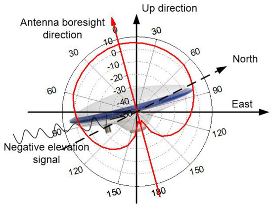 The local Cartesian coordinate system with the origin at the GNSS phase center of the LEO satellite is used to calculate the nominal elevation. The up direction points towards outer space, as shown in Figure 1. The GNSS antenna boresight for ground-based applications normally coincides with the up direction, while the onboard GNSS antenna boresight depends on the satellite attitude. For the earth-pointing attitude mode, the boresight direction may be the same as the up direction. For the sun-pointing attitude mode, the boresight direction depends on the geometrical relationship between the satellite, the earth, and the sun. The motion of the LEO satellite around the earth produces a changing discrepancy between the antenna boresight direction and the up direction. The boresight direction presents a large discrepancy with the up direction, which has a strong impact on the GNSS signal. The impact depends on the antenna radiation pattern, which is illustrated in Figure 2.