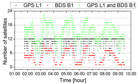 Due to the platform energy constraint of the Luojia-1A satellite, the dual-frequency GNSS receiver is only active during the mission period. Only GPS/BDS data on 8 June 2018 with a 1 s sampling interval were collected in this experiment. In this study, we used GPS L1 and BDS B1 measurements for validating the proposed weighting model and single-frequency cycle slip detection algorithm. The dual-frequency reduced-dynamic orbit determination results, of which three-dimension overlapping precision is about 6.7 cm, are used as the reference orbit for evaluating the KOD accuracy using the proposed strategy [45]. Figure 6 shows the number of all visible satellites.
