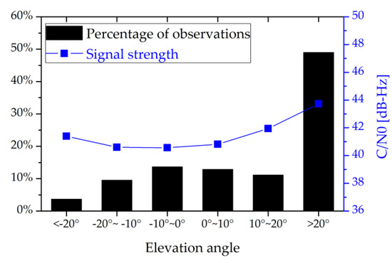 Figure 7 indicates that the satellite is capable of tracking observations of low-elevation angles, even negative angles, and the low-elevation measurements (<20°) contribute to about 50% of total measurements. The LEO onboard receiver still tracks the signals with a sufficient amount of C/N0 strength, which shows a parabolic relationship with the elevation angle caused by the satellite attitude mode. The C/N0 in Figure 7 denotes the average value in the range of ten degrees. The average C/N0 is calculated every ten degrees as the elevation angle increases. It can be seen from Figure 7 that the signal strength of observations from the LEO onboard receiver in the range of −10° to 10° elevation is close to that of the 10° to 20° elevation angle and is on average 1.8 dB-Hz lower than that above the 20° elevation angle. It shows that the signal strength of the −10° to 10° elevation angle observations has about the same data quality as that of the observations in the range of 10° to 20° elevation. Therefore, the low-elevation observations can be used if a suitable weighting model is built for the LEO KOD.