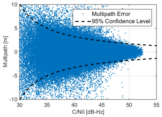 Figure 8 indicates that the multipath and observation noise is strongly correlated to the C/N0, and thus the weighting model is reasonable, especially during the attitude maneuver. The observations with C/N0 below 30 dB-Hz are not considered in this study. According to the MINQUE method, the estimated coefficients and of the proposed C/N0-based weighting model are 663.826 and −664.125, respectively. The dashed line in the figure shows the 95% confidence level of the observation noise, which agrees well with the data. It should be mentioned that the coefficients are the same for GPS and BDS because they are estimated with both GPS and BDS L1 measurements. Considering that the C/N0 characteristics may vary in different constellations and signals, but we are limited by the length of this paper, so in the next step it is worth conducting further comprehensive research on different models for GPS and BDS, respectively, even for each satellite signal.