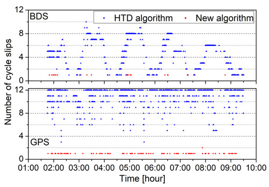 Figure 9. Number of GPS and BDS cycle slips detected by the HTD algorithm and the new algorithm considering the clock steering events.