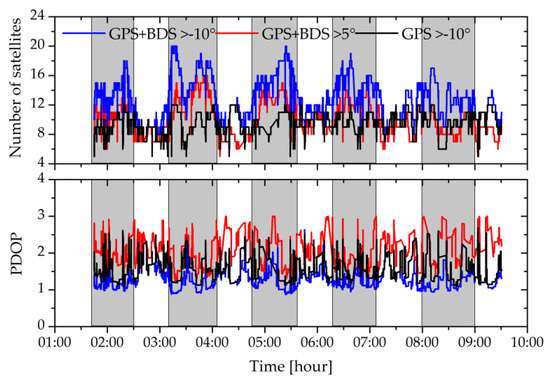 Figure 10 shows that the number of available satellites ranges from 5 to 20 and the PDOP value ranges from 0.875 to 2.685 for the −10° elevation mask scheme in the GPS/BDS combination, denoted by the blue line. There is an average of 10 satellites available above the 5° elevation angle and an average of 13 satellites above the −10° elevation angle, achieving 37.5% improvement in PDOP by decreasing the elevation cutoff angle to −10°. The shadow area shows that BDS has a clear contribution to both the number of available satellites and the PDOP when the Luojia-1A satellite flies over China, since the orbit period of the Luojia-1A satellite is approximately 96 min, and Luojia-1A is designed to track the signals of the BDS regional system. During these periods, the GPS/BDS combination has on average five satellites more than the GPS-only case. The average PDOP for the cases of single GPS and the GPS/BDS combination are 1.526 and 1.277, respectively, which is an improvement of 16.3%.