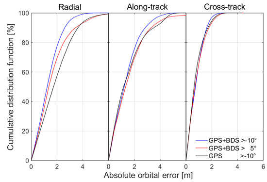 The impact of low-elevation angle measurements on orbit determination and the contribution of BDS to the KOD is shown in Figure 11, which is the cumulative distribution function of absolute orbital error in the radial, along-track, and cross-track directions, respectively. The kinematic orbital error is also evaluated in terms of root mean square (RMS) error. Table 2 shows the statistical performance of the positioning accuracy.