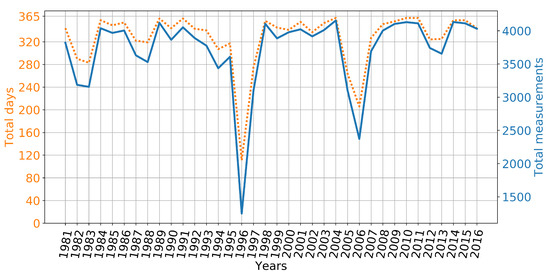 Number of annual total available days (orange dotted line) and number of annual total available GHI measurements (blue line) for the entire period (1981–2016).