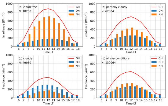 Averages of hourly irradiance values (Wm) for global (GHI), diffuse (DHI) and direct (NHI) horizontal surface solar irradiances for the period 1981–2016 under different sky conditions: (a) cloud-free sky, (b) partially cloudy, (c) cloudy, and (d) all sky conditions.