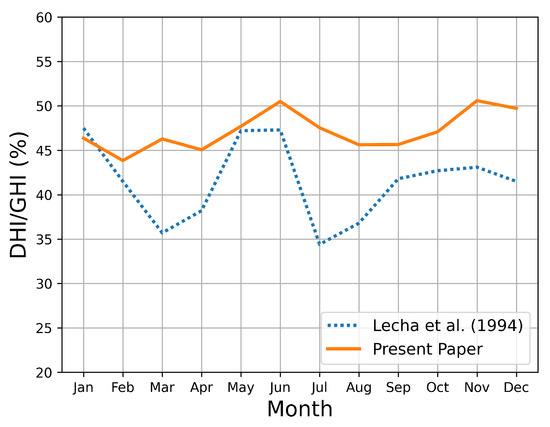 Ratio between the monthly averages of diffuse (DHI) and global (GHI) horizontal surface solar irradiances for the entire period of measurements. Values from Lecha et al. [31] are included (blue dot line).